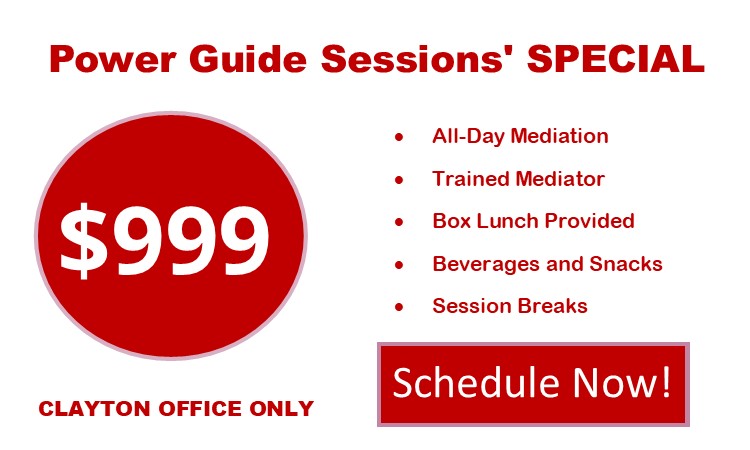 All-day (8am-6pm) or half-day (morning or afternoon) mediation. All-day mediation special listed above. Half-day mediation (5 hours) $620 per session.